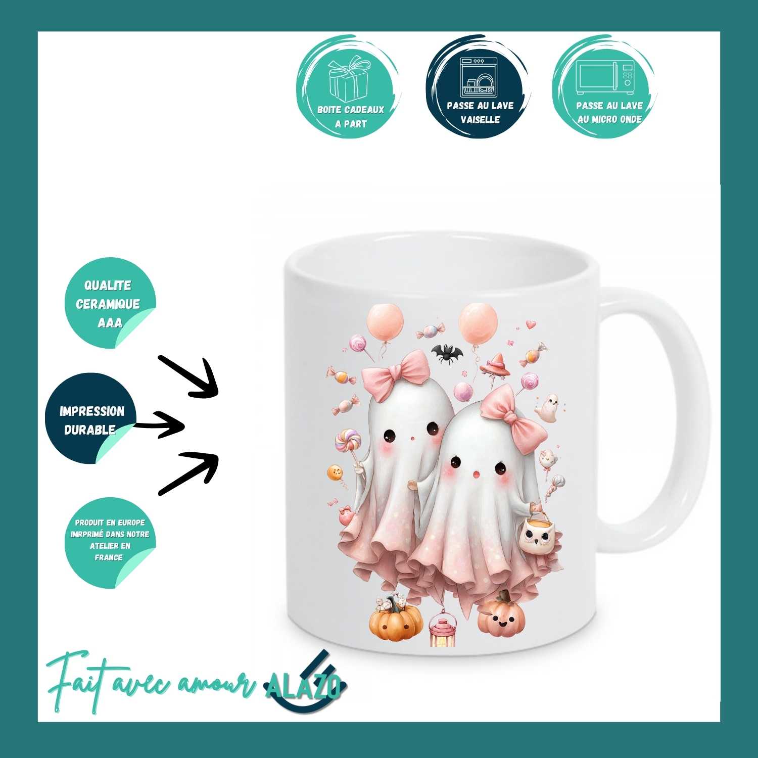 Deux adorables petits fantômes assortis, coiffés de nœuds roses, entourés de citrouilles, bonbons et décorations d’Halloween. Ce mug est une explosion de tendresse qui transforme chaque boisson chaude en moment joyeux et réconfortant.